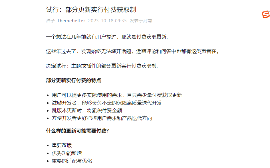 ThemeBetter开发者准备开启付费更新 WordPress资讯 10月18日 维多护卫队管理员 取消关注 关注 私信 ThemeBetter开发了DUX主题、XIU主题等多款优质的wordpress主题,近日,该开发者在他们的公众号上发布了一篇文章,准备开始尝试付费更新。
